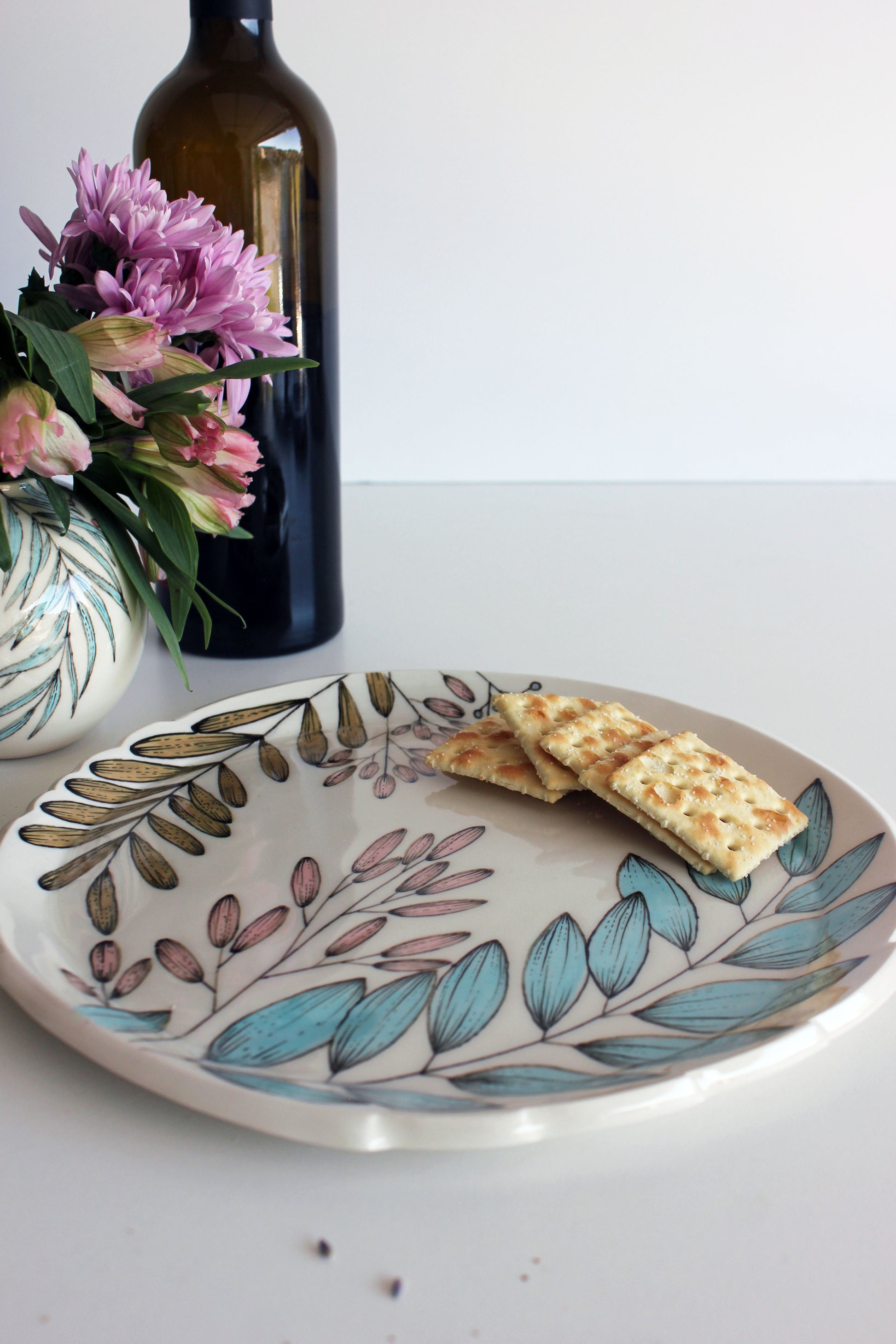 Dinner plates are perfect for those who love unique floral patterns. Most of my works are inspired by nature. This handmade dish has exclusive shape from porcelain clay with melon colors and unique hand drawn patterns to create originality.