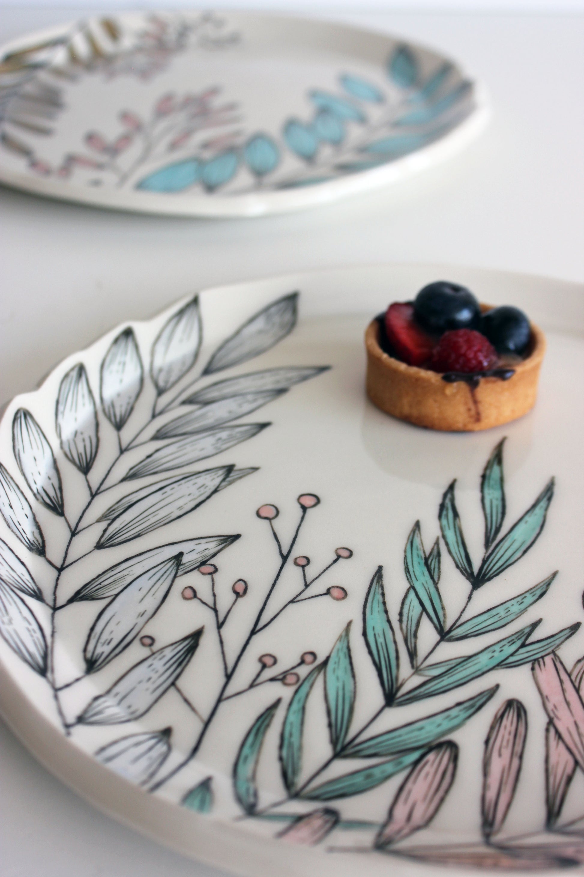 Dinner plates are perfect for those who love unique floral patterns. Most of my works are inspired by nature. This handmade dish has exclusive shape from porcelain clay with melon colors and unique hand drawn patterns to create originality.